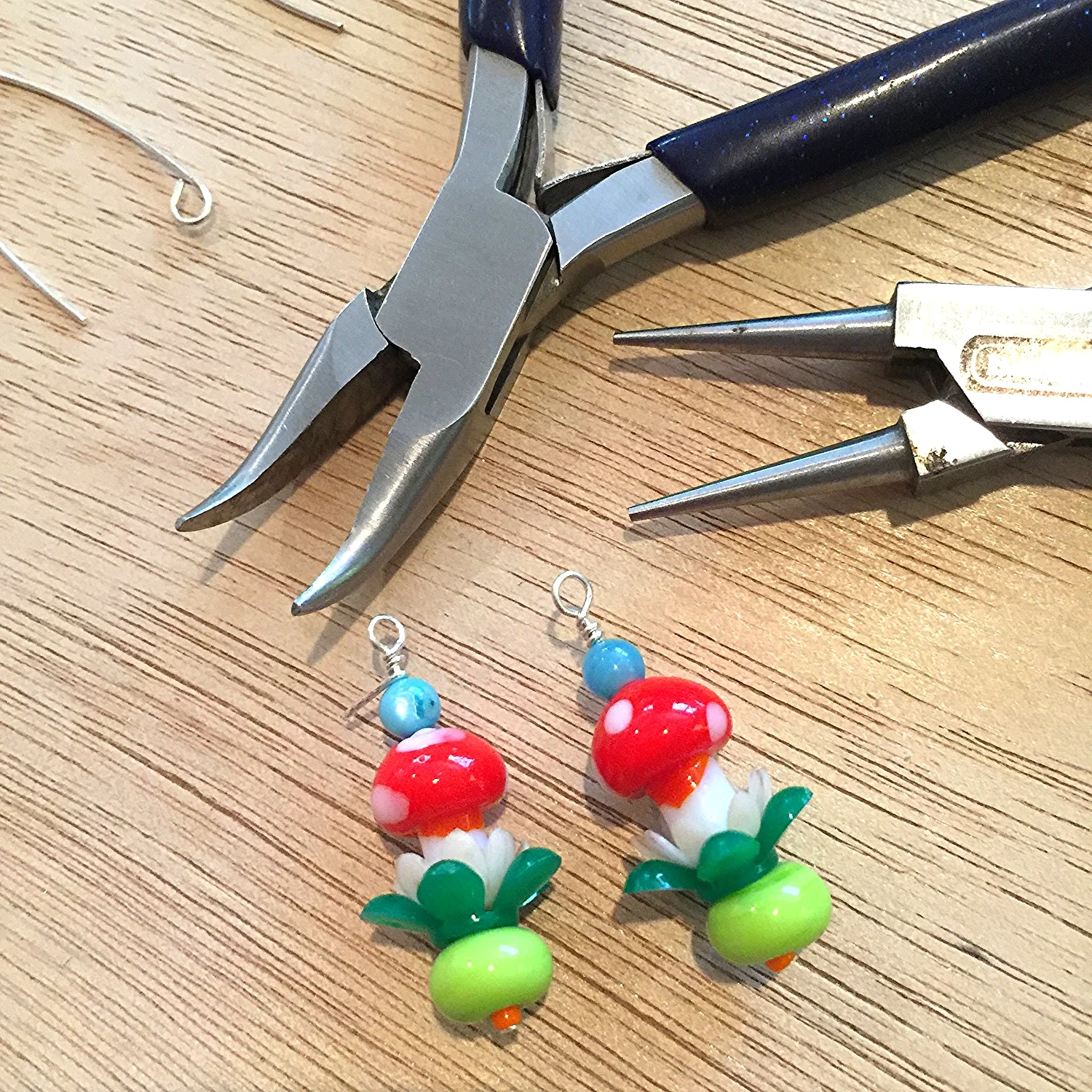 Play with the arrangement until you find the right balance of colors and shapes. I rediscovered glass mushroom beads in my stash and turned them into a pair of earrings too.